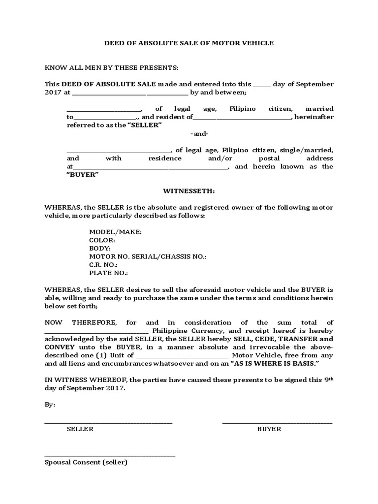 DEED OF ABSOLUTE SALE OF MOTOR VEHICLE Format.docx | Deed | Property Law